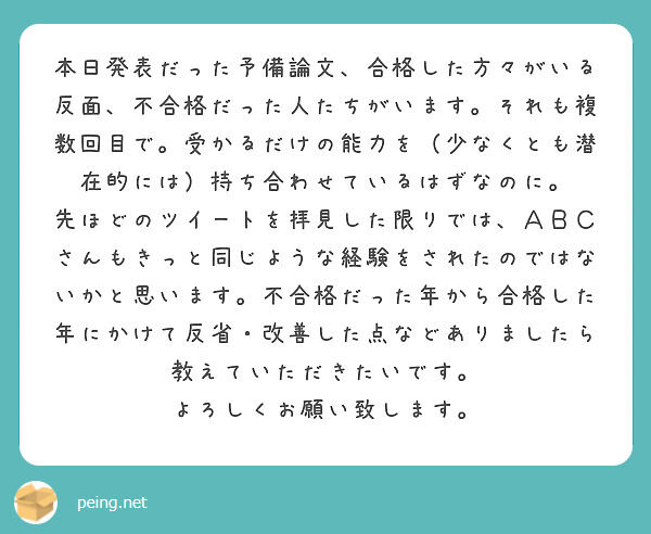 予備論文に不合格だった夜に感じたあれこれが、くじけそうなとき何度も奮起させてくれた。不合格を受けてすぐ立ち直れている人はもちろんすごいし、悔しくて悔しくてしょうがない人も、その悔しさが高みへ連れて行ってくれるはず 大丈夫!