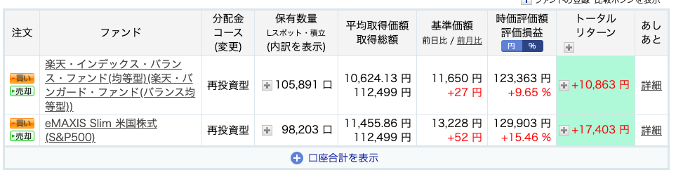 楽天証券で、楽天・バンガード・ファンド(バランス均等型)とeMAXIS Slim 米国株式(S&P500)を、毎月12,500円ずつ積み立てています。