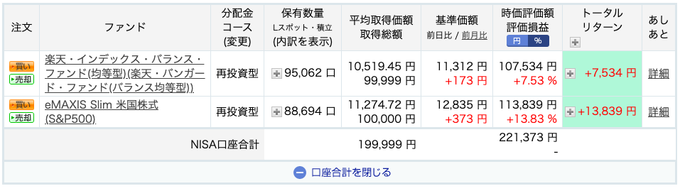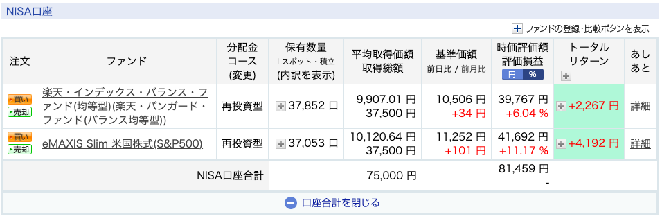 私は、楽天証券のNISA口座で、楽天・バンガード・ファンド(バランス均等型)とeMAXIS Slim 米国株式(S&P500)を、毎月12,500円ずつ積み立てています。