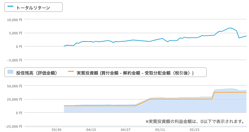 プラス分の大半は、米国株が大きく落ち込んでいた4月初頭のタイミングで購入できたのがそのまま反映されています。